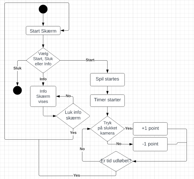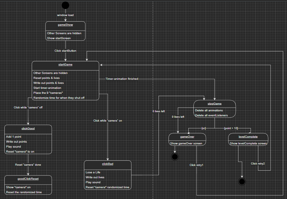 Before we properly started coding, we were tasked with creating a statediagram to help us envision the code and the steps each function should do. While this was incredibly helpful, it did cause me somewhat confusion as while I was programming the game, I began seeing places I could optimize and change, hence is why the statediagram is no longer as accurate as it once was.